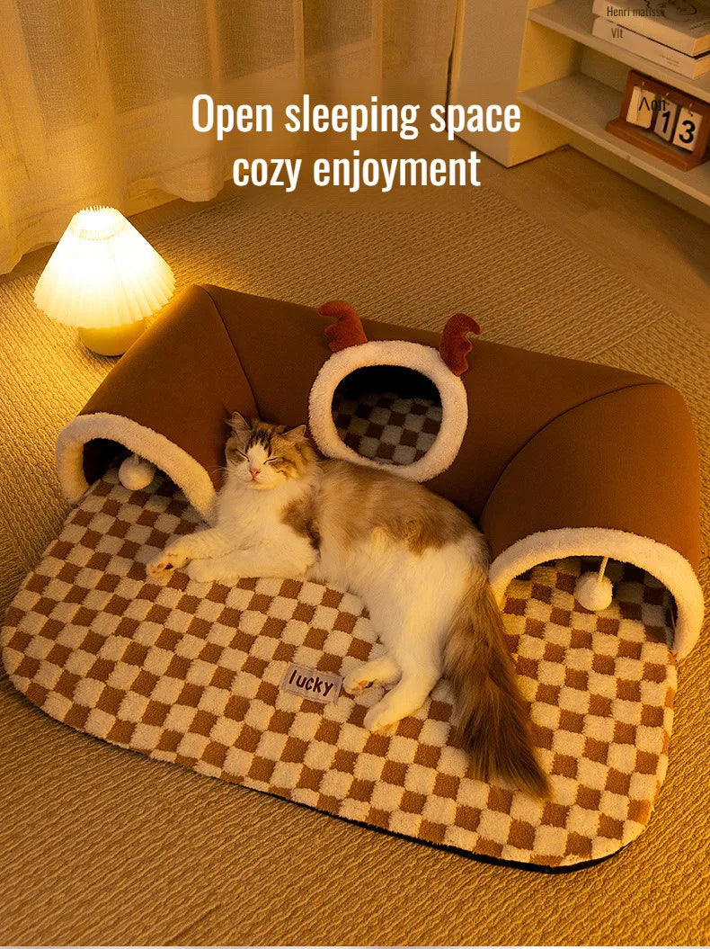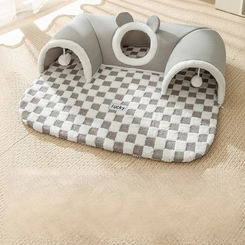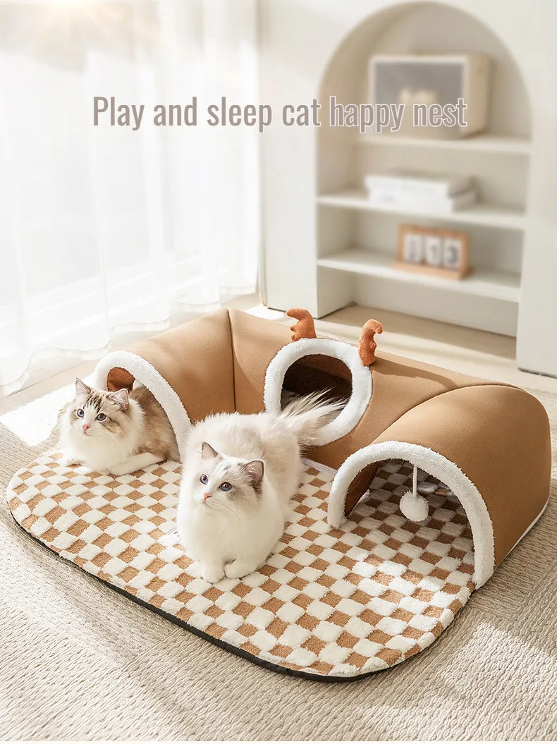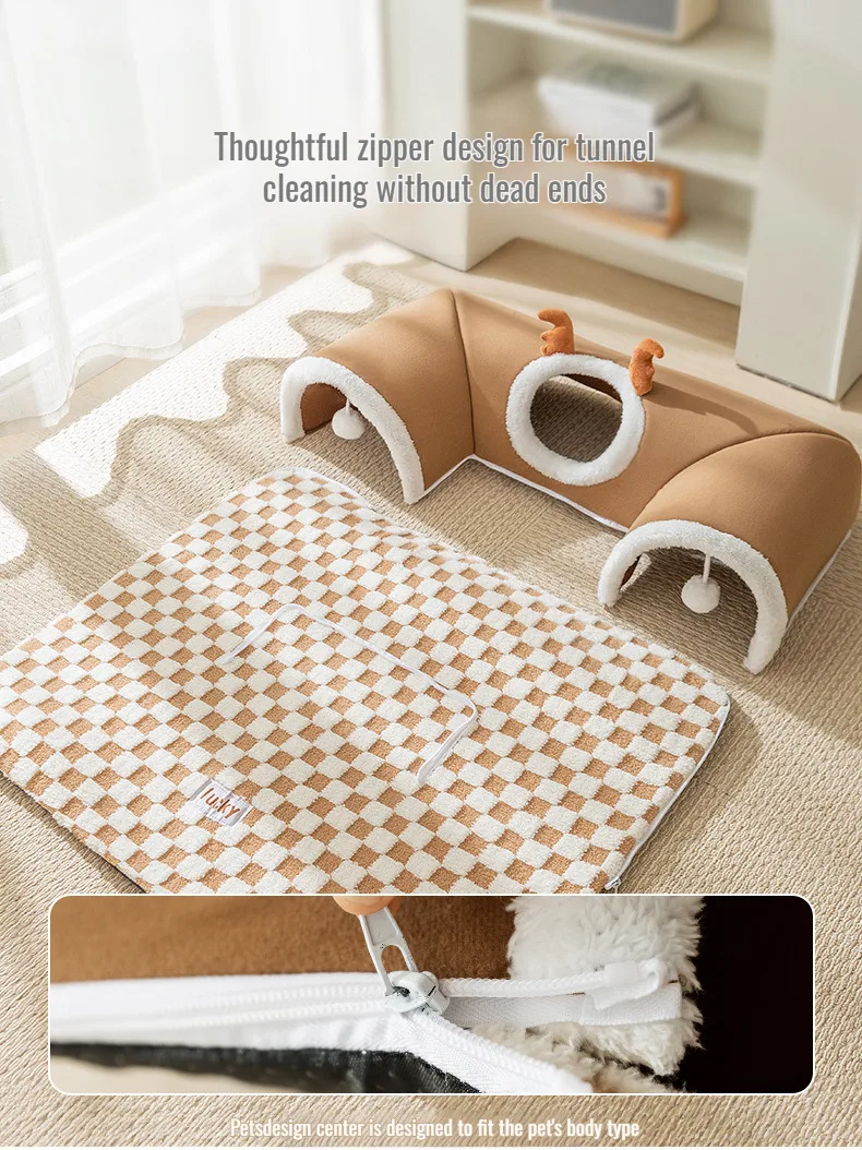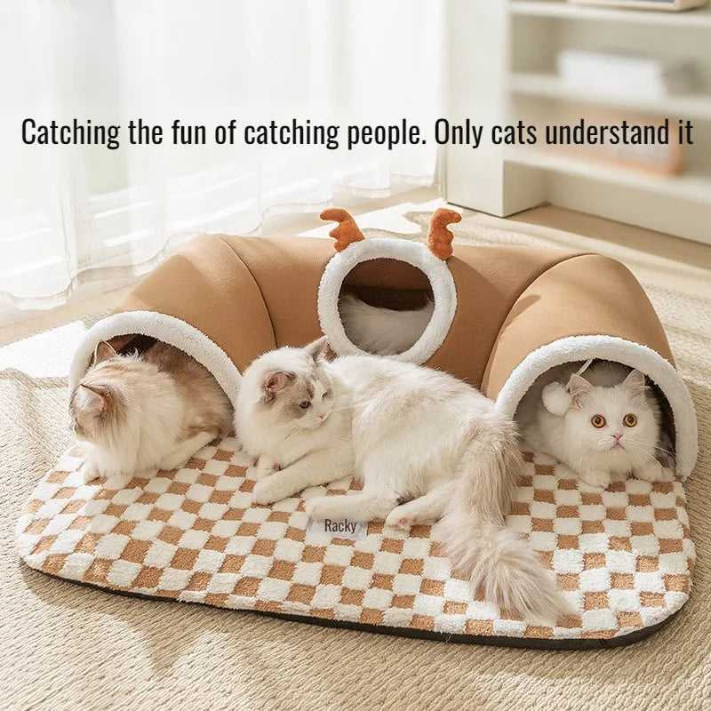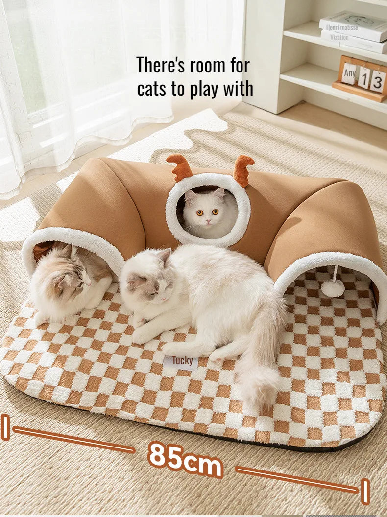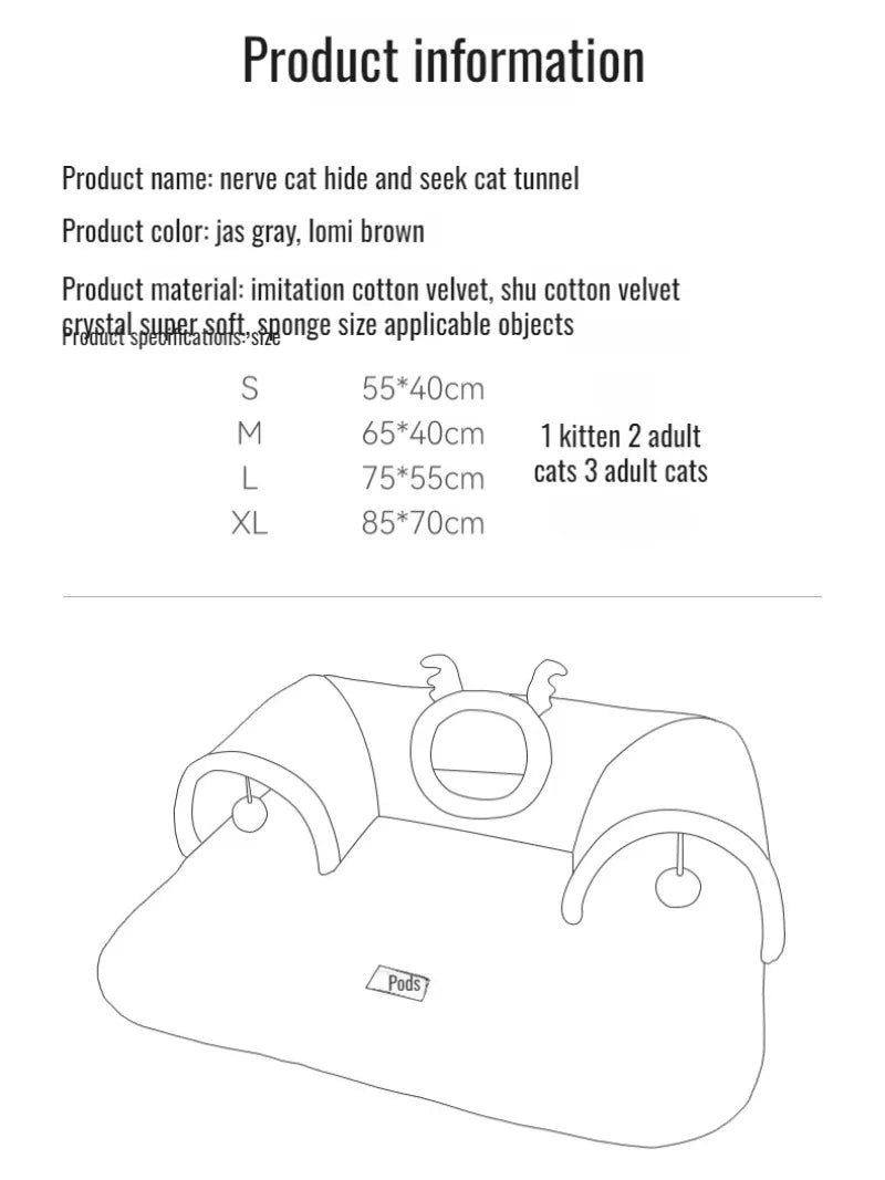 Welcome to the ultimate hangout for Michi's who love to lounge and snoop. Michi’s Peek-A-Boo Tunnel Villa is a plush, multi-entry wonderland designed for the feline who insists on having options—options to nap, options to hide, and of course, options to pop out dramatically when humans least expect it.