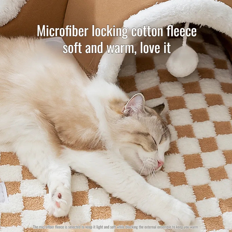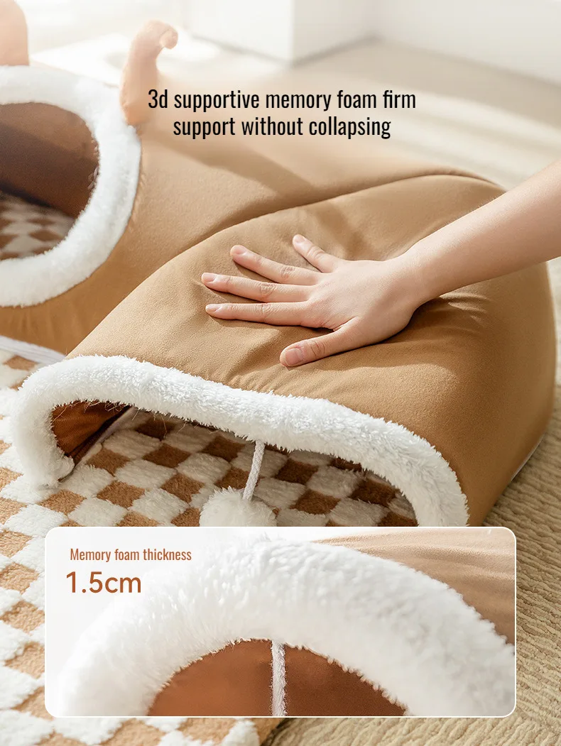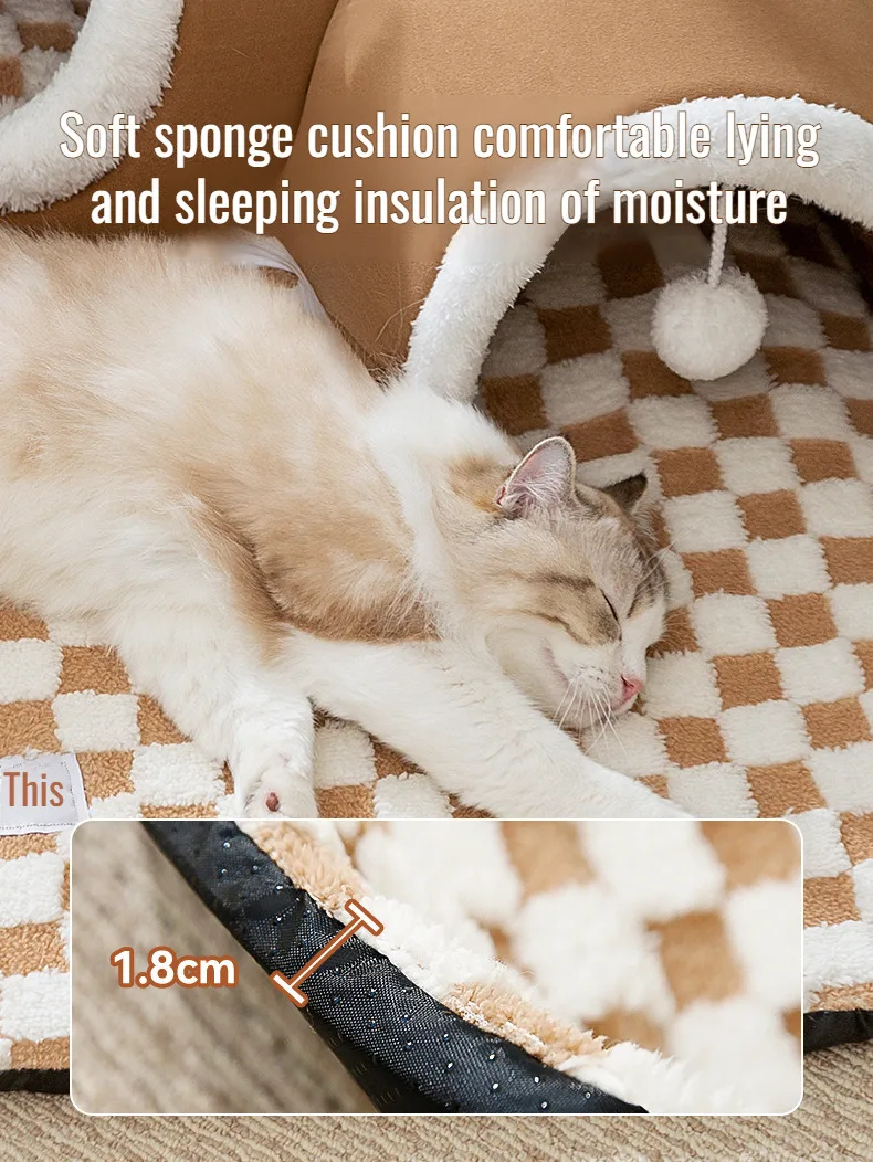 Crafted with ultra-soft imitation cotton velvet and a cozy microfiber locking fleece interior, this villa keeps your furry royalty insulated, warm, and spoiled in every season. Each tunnel is supported with 3D memory-foam structure that prevents sagging or collapsing, even under the weight of the chunkiest, most majestic Michi.
